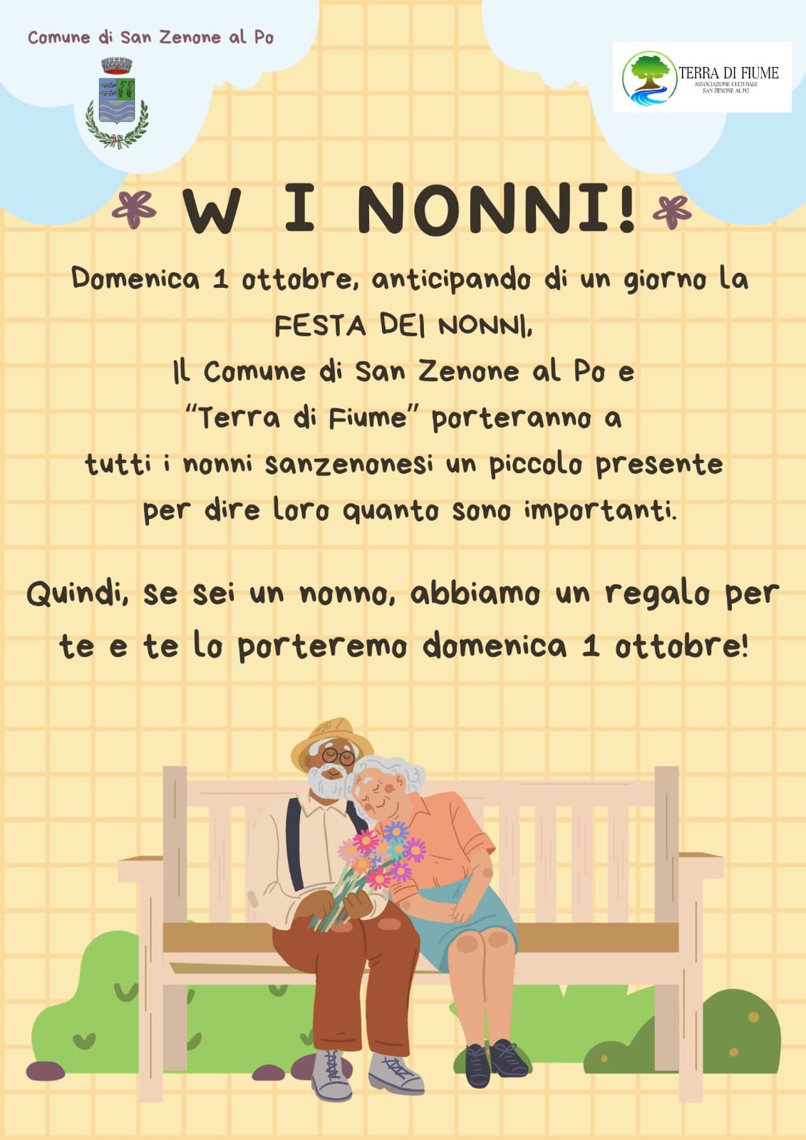 'Associazione Culturale "Terra di Fiume", con il supporto del Comune di San Zenone al Po, ha pensato di festeggiare i nonni sanzenonesi con un piccolo pensiero che verrà recapitato direttamente a domicilio, domenica 1 ottobre (anticipando di un giorno la data della Festa dei Nonni).