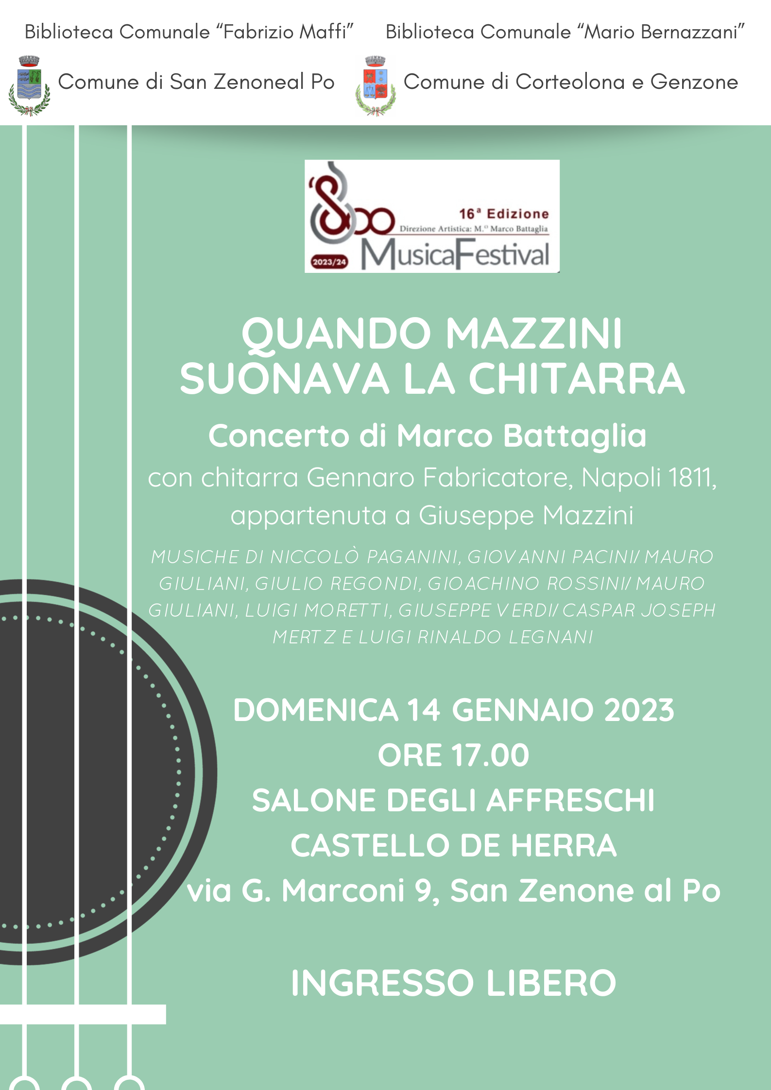 Siamo lieti di annunciare che domenica 14 gennaio alle ore 17.00, il Salone degli Affreschi del Palazzo Comunale ospiterà il concerto "Quando Mazzini suonava la chitarra", con Marco Battaglia che suonerà per l'occasione una chitarra "Gennaro Fabricatore" (Napoli, 1811) appartenuta a Giuseppe Mazzini.