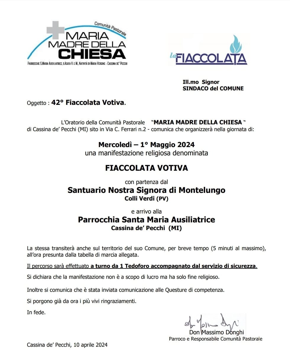 Informiamo i cittadini che il 1 maggio transiterà anche nel nostro territorio comunale la 42° edizione di una fiaccolata votiva organizzata dall'Oratorio della Comunità Pastorale "Maria Madre della Chiesa" di Cassina De Pecchi (MI).