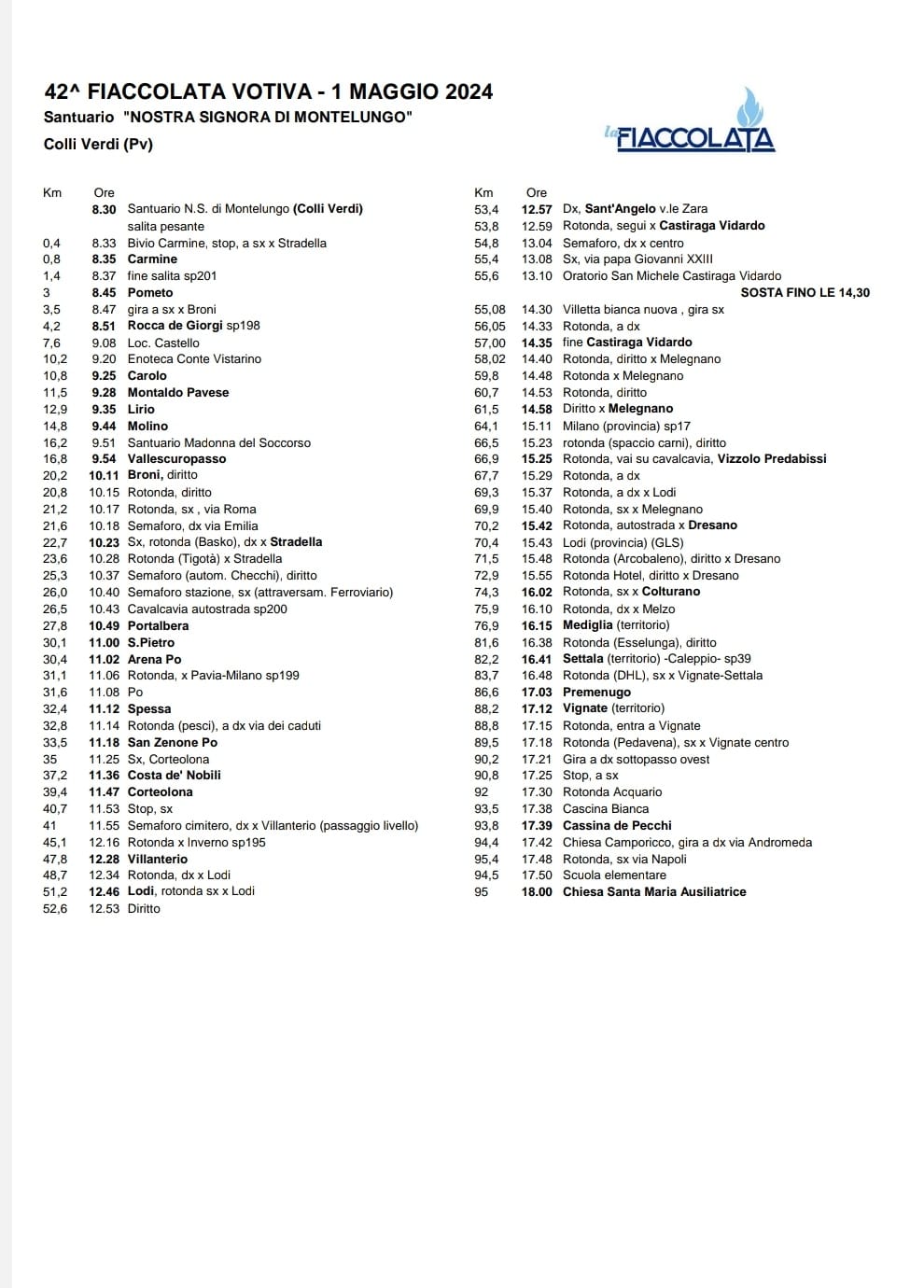 In allegato, la tabella di marcia. Il passaggio a San Zenone è previsto per le ore 11.18.