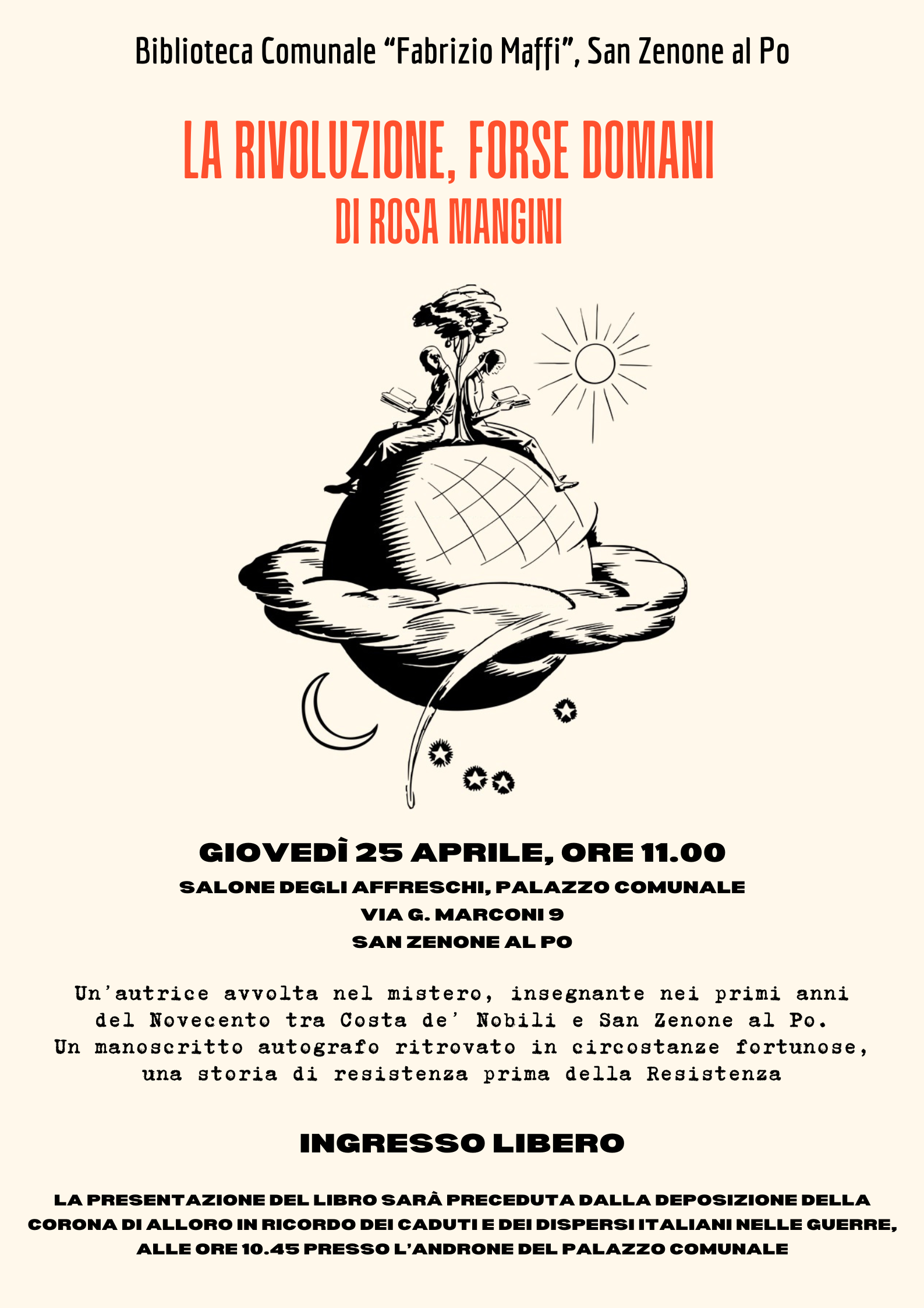 In occasione del 25 Aprile la nostra Biblioteca Comunale propone la presentazione del libro "La Rivoluzione, forse domani", di Rosa Mangini, alle ore 11.00 presso il Salone degli Affreschi.