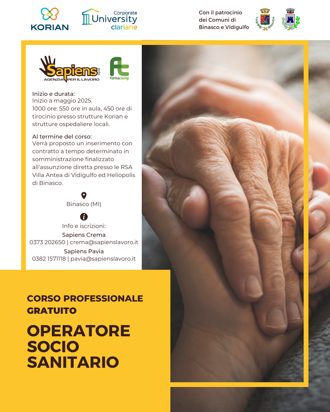Informiamo i cittadini della attivazione di questo corso oss gratuito che si terrà a Binasco patrocinato dai Comuni di Siziano e Binasco.